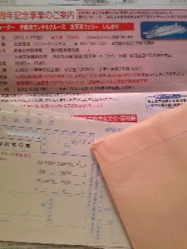 短大の同窓会からお知らせが届きました。今年で同窓会創立50周年だそうです。数ある記念事業のひとつに太平洋フェリーいしかりをチャーターしての伊勢湾ランチ&クルーズというのがあるのですが参加費用2000円で同窓生とその家族が対象・・・と来たら、行くよね、行かない手はないヨネ!めずらしく、揉めずに即決。 というわけで、早速申し込みの振込み用紙にイソイソと記入・・・私:「じゃ、先着順だから明日早々に申し込むね♪」家人:「楽しみだね。ところでそれはいつの日曜日?」私:「5月27日。まだちょっと先だね」家人:「5月27日・・・」私:「そう、5月27日・・・」・・・ ・・・ ・・・(はっ!←思わず顔見あわす)義母の一周忌と義父の三回忌! あ、あぶなかった~ A=´、`=)ゞ4000円をフイにするところでした。おっと、忘れていたわけじゃないんよ、おやじさん&おふくろさん。ちょっと華やかそうな催しに目が眩んだだけ・・・まあまた機会はあるさ。(あるかな・・・)ほんの一瞬夢を見て大盛り上がりしたたんご家の夜は静かに幕を閉じました・・・。