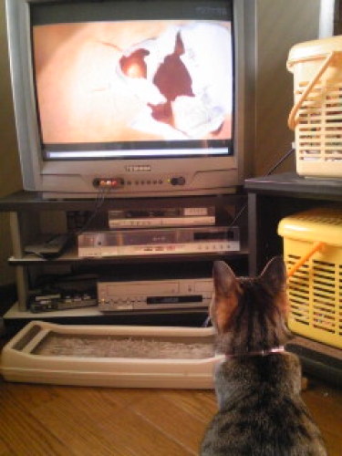 お、細猫がEテレ観てる(見てる、ではなく)。 観てる。 もうちょっと。 生まれた!ここまで見届けて、細猫はトイレに走り去りました。 バトンタッチ? 大きくなれよ・・・ 我が家は受信料の払い甲斐があります(笑)
