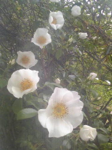 ナニワイバラが次々と咲いています。 部屋の中からもよく見えます。 「・・・よく?」ガ、ガラスは連休中にフキフキいたしますです、ハイ。