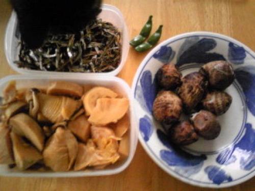 スーパーで掘りたて1本198円で売っているのを迷いに迷って買わずに帰ったら・・・ なんと たけのこ、届いた~!母の調理済みで(笑)。 ふかした里芋と、佃煮風の田作りも。その田作り、撮影中細猫に1匹とられた・・・(が、取り返した。)人間が食べている時はうらやましそうに見ていても手は出さないのに。カメラを構えている時はガードが甘いと知っての所業か?寝ていると思って油断していると、いつのまにかフレームに入り込んでいます(笑)。 ゆでてアク抜きしただけ(そこまでが大仕事)の たけのこも少し入れてくれていたので昨年作って好評だったメンマっぽい料理 を また作ろうかしら、と。