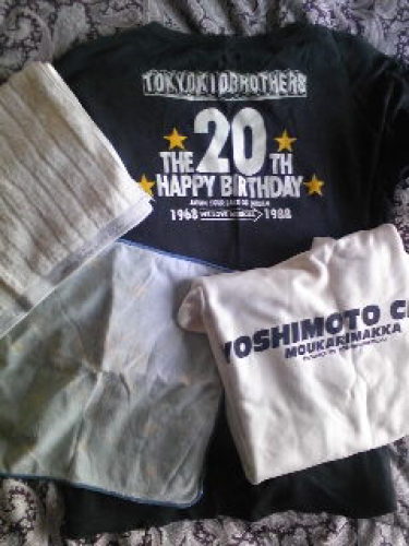 実用品としてはとっくの昔に用を終えています。スポーツタオル・・・今井美樹(20年くらい前~)ハンドタオル・・・スタレビ10周年(21年前~)黒Tシャツ・・・東京キッドブラザース20周年(24年前~)白トレーナー・・・吉本(15年くらい前~)×2着 (家人とペア。今では考えられない) さすがにもういいでしょう・・・写真に収めたらふっ切れたわ。これら古いおもひでの品の処分を決意するのに何年かかったことか。や~れやれ これでやっと栓が抜けました。さらば青春(!?)の遺物(今までは遺産と呼んでいた)そしてこんにちは収納スペース! 実際こういう類のものはまだまだどこぞに眠っているはずだけど。ラジオでハガキ読まれて送られてきた番組Tシャツとかバブル後期の海外旅行のお土産Tシャツとか・・・とか・・・とか・・・あぁ~・・・