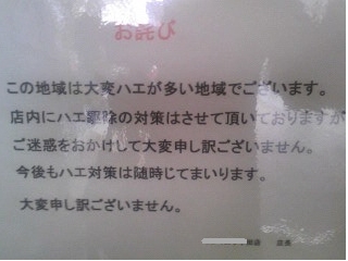 とある飲食店にて入り口のドアに貼ってありました。食べる前から ハエ、ハエ、ハエ、と・・・。 言い訳めいたお詫びはともかくとして、ちょっと食欲減退・・・(苦笑)