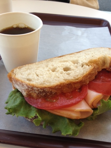 朝は「パンのトラ」のカフェスペースにて。今日は「豪快ハムサンド」(270円)とやらを選びました。中はクリームチーズたっぷり~ 7時から開いているのはありがたいです。(コーヒー無料サービスも!)