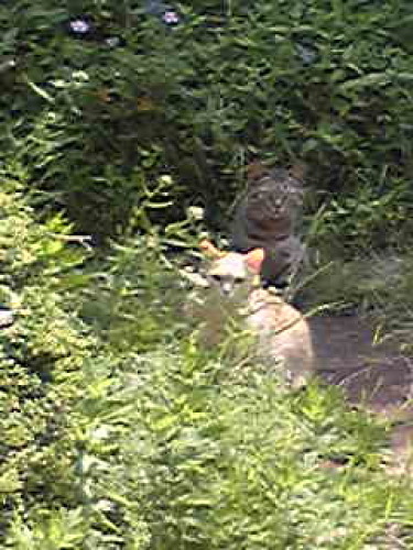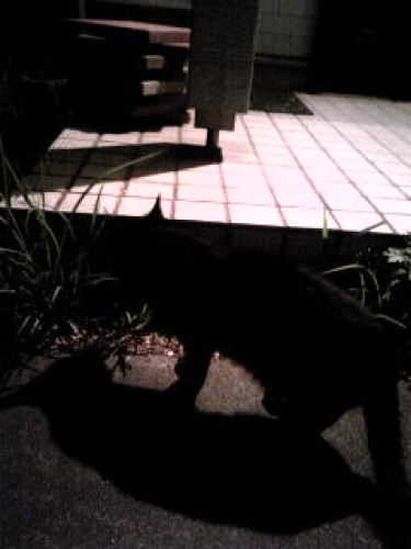 センサーライトの灯りに逆光で浮かび上がる黒い・・・黒ちゃん!影も黒。まるで2匹いるみたいだ。 夜もパトロールに来てるんだね~。食後のデザートに我が庭の草が選ばれているのか?とも・・・(笑)網戸越しにあいさつしていくのでビックリしたよ~(夜の黒猫は暗闇に目だけがランランと!)ミュージカル「CATS」のポスターみたいだった・・・