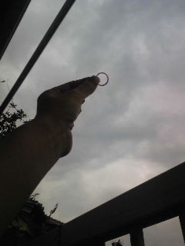 太陽と 月と 私(地球)が一直線に並んだ瞬間・・・(イメージ) 朝6時から、出勤の家人そっちのけでベランダに陣取ってました。が、結果はご覧の通りで~す。 でも、最大蝕の時間には、あきらかに周囲の雰囲気が変わりました。ほんのり薄暗くなり、カラスがギャアギャア騒ぎ出しうちの猫たちもいきなりダダダダッダダダダッ!と走って暴れました。(あと、ご近所のあちこちからブーイングの声が・・・笑) 欠け始め~最大蝕(金環)までに関しては惨敗でしたが午前8時ごろ、あきらめて梅ちゃん先生でも見ようか・・・と思った頃、出た!と、思う間もなく みるみる晴れて・・・ 見えた! 木漏れ日観測 穴あきおたまで観察 途中からでしたが日食終了まで一時間近く、太りゆく太陽を観察。 あ~おもしろかった!遮光板もなんとかただの記念品にならずにすみました。(あと30分早く晴れていたら・・・と思うが、まぁしゃーないやね) 次回金環食は、2041年の10月25日だそうです。(名古屋の場合)それまでアイマスクとして使うか・・・(笑)