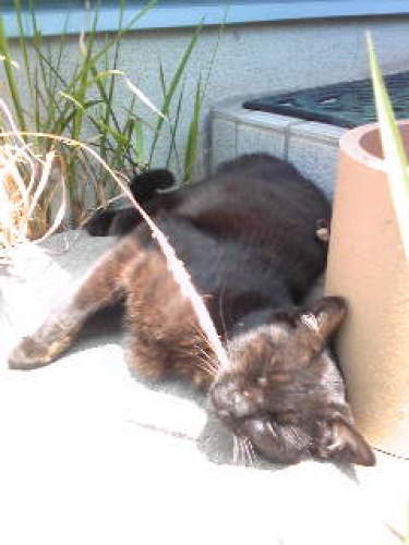 庭で草取りをしていると割と高い確率で現れる黒猫・黒ちゃん 。最近真っ黒じゃなくなってきたねぇ。ヒゲと耳の中の毛が白、全体には虎模様も出てきました。 でも、「超」が付くほどフレンドリーな態度は相変わらずです。しゃがんでいる足元でごろりん。 踏まれないギリギリの位置取り。 だけどこちらからなでるとちょっと意外そうな顔をされる。 なんにもないけど、まあ無農薬・有機農法(?)の草でもかじっておいきなさい。(できたら全部かじりとっていってもらえると、助かるのじゃが)