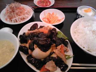 今日、外で食べたランチ。キクラゲと豚肉炒め(680円) 「本日のラッキーカラーは黒」に後押しされました(笑)基本的にキクラゲは好きですが、キクラゲメインの料理は初めてだなぁ。(キクラゲ:豚肉:野菜=5:2:3。いやキクラゲはもっと?)味付けもいいし、なんといってもこの食感がグー。(うっかりほっぺの内側も二回かんでしまったけど) あ~満足満足、満腹だ~!(ちょっと白飯多すぎ~!)