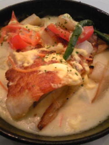 白身魚と野菜のオランディーズソース。(あ~、今見るとすごく美味しそう) 体調悪く食欲のない時に付き合いで食べる食事は拷問的・・・お持ち帰りするわけにもいかず、かといってお残しはいや。選べるメニューの中で一番アッサリしていそうな一品を選んだのですがオランディーズソースって主材料がバターと卵黄なのね・・・(後で知った)おまけに食材もバターでソテーしてありました。次はぜひ、体調万全空腹状態でめぐり合いたいものです。(今日は涙目笑顔で完食~)