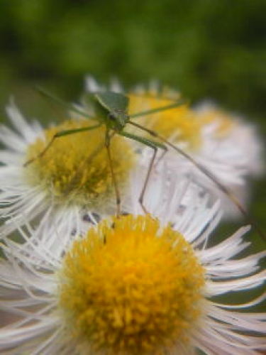 ヒメジョオン(ハルジオンかも)がかわいいので寄ってみたら目が合ってしまいました。 花三つ分、独り占めです。実際は2センチくらい。(触覚は除く)