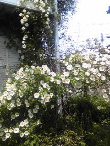カロライナジャスミンに加えて、今年はナニワイバラも庭から上(ベランダ)まで上がって花を咲かせました。 なんかもう、物干しスペースがどんどん狭くなってくるっす。 でも・・・メルヘンチックな風景といえなくもないよね? 洗濯物さえ干さなければ・・・ それから、花に寄ってくる虫さんがもう少し遠慮してくれれば・・・(この日は天気が悪くて蜂は少なかった)