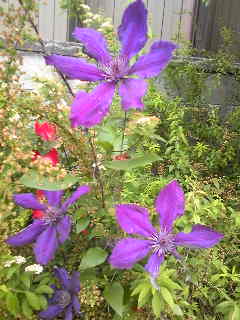 久しぶりに手放しで思いっきり褒められました~通りすがりの犬のお散歩マダムに。 マダム:「おきれいですねぇ~」(いえいえ、とんでもない。ちっとも構っていなくてお恥ずかしいです)「ここを良く通りかかるのですがいつも感心しているんですよ」(私あまり表に出ないけど・・・)「ほんとうに大きくてお見事で・・・」(確かに最近とみにボリュームアップしております)「色合いがなんともいえず、いいわねぇ~」(くたびれたデニムの作業着の・・・?) 「・・・このテッセン!」ありがとうございます。 うん、まあそういうことヨネ、たはは・・・(途中からうすうす気づいてましたけど)庭の花を褒められるのは自分を褒められるのと同じくらいうれしいので結果オーライ。(ってことで) それにしても自分が褒められていると都合よく信じられるこの図々しさは一体どこでいつのまに培われたのか自分でもさっぱりわかんない。でもそんな自分が・・・すき♪(笑)