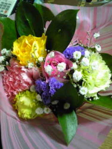 母姫誕生日~はい、これ私から。(500円のミニブーケですが) 恭しく渡したら、母の顔がパァァーッとほころんで「これを持ってお父さんとふたりで写真を撮りたい」だって。ううぅ、泣かせるなぁ~。 なのに父の通院と部屋の片付け(妹が帰郷のため)でバタバタしているうちに撮る暇がないままうっかり帰って来ちゃった。ごめん、花がきれいなうちに、また。