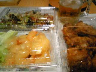 今晩は中食。テイクアウトで中華。まさに中食。 お店の三周年記念で、半額になったメニューから三品。(ホイコーロー・海老マヨ・鶏から揚げ)家人がたいそう張り切って買ってきました。調理したてのアッツアツです。ビールも進むったらありゃしない♪二人分の腹に余るほどの量で千円ちょい。大満足だー!!