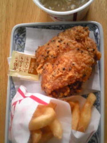 旨塩生姜チキン・生姜スープセット。カード提示で5%引きの日だったのでスチャッと見せたら「当店ではポテトSが一つサービスになりまぁす♪」で、ポテト2個になっちゃった(苦笑)610円から5%引きより断然オトクなんですけどね~ おや? (チキンの匂いに寄ってきました) おやおやズボッ! あれまぁ残念ながら、どこまでもぐっても匂いだけだよ~ん