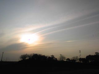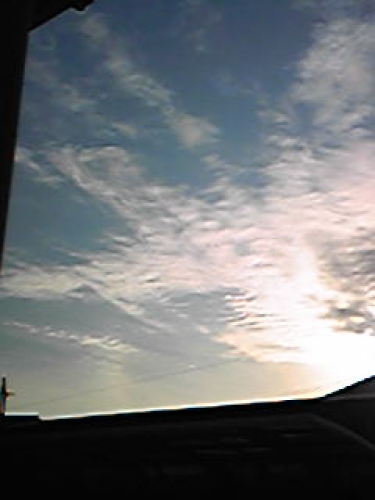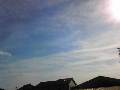 朝8時過ぎの空。 虹色の暈がかかっていたのでよく観ようとするのですが冬は太陽が低くて強烈な光が直で目に入ってきます。しばらく目の前が水玉模様でした・・・(笑) 日食の時のメガネを着けたかったけど、それでは太陽以外、見えないものな。