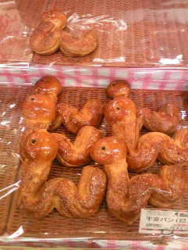 干支パン発見にょろにょろ~、98円ヘビの行進。 デニッシュ生地にメープルシロップ。つぶらな瞳(笑)売れてるのかどうかはわからないけどもし立体的にとぐろを巻いたデザインだったら、私は買ってみたかもヨ?