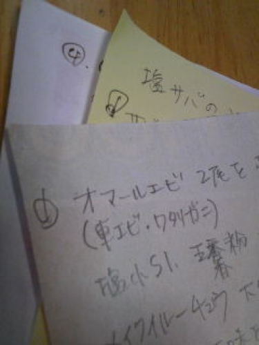 十数年前のレシピメモが出てきました。チラシの裏に走り書き。けっこう懐かしい。 「切り干し大根の・・・」や「塩サバの・・・」などの基本的庶民レシピの中から料理名がない、気になるメモが。 「オマールエビ」て。 五香粉とかメイクイルーチュウとか。意外にも中華料理ですね。それにしても「オマールエビ」て!どこで調達するつもりだったんだろ(笑)。これをメモったときの自分の気持ちがしれません。 落書きも一緒に出てきました。寝姿がかわいかったから描いたんでしょう。今は気軽にケータイで撮れちゃうから描かなくなった。これは・・・とっておこ。