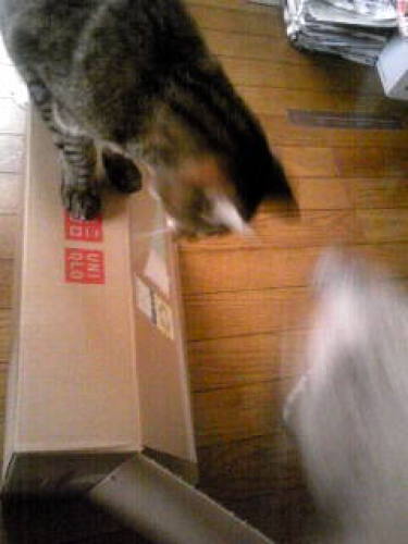 後から来た太猫を果敢に追っ払って・・・ 新しい空き箱を独り占めしてご満悦の細猫。 そこまでは良かったが・・・ 後のお楽しみにとっておいたおやつの残りをアライグマが食べちゃってますから~ 「ナヌ!?」ザンネン!
