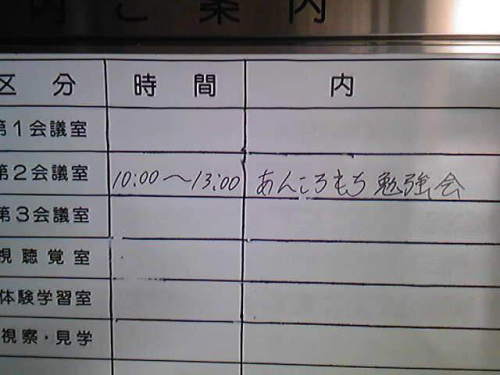 息苦しいほどの蒸し暑さですよ。熱中症厳重警戒ですよ。そんな今日のお昼前、とある公共の建物の一室にてこんな集会があったもようです。3時間も…この時間帯から察するに、午前中に作り方のレクチャーがあって、昼食はきっとあんころもちを食べるんだろうな~あ~でも会議室で・・・小豆を煮たりお餅をついたりする? どのような段取りで参加者があんころもちを勉強されているのか勝手にいろいろ想像しつつも今日はちょっとあんこは遠慮したい私です(勧められてもいないけど)
