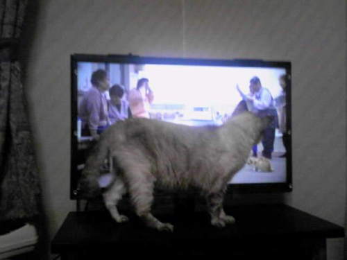 ブラウン管テレビ時代。(数日前まで)上下に黒帯が入ったり、サイドがカットされて端の字幕が読めなかったりしたものですが 地デジ対応の薄型テレビに替えてからは・・・テレビの前にできたスペースが 猫の通り道となりかえって見える部分が減ったような。せっかくのフル画面なのにぃ。