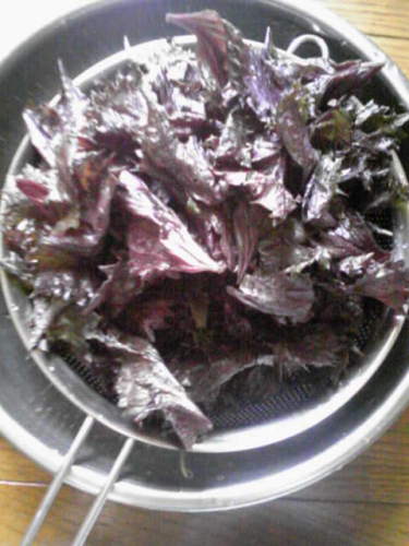 先日の梅がいい感じになってきた(梅酢が十分上がってきた)ので赤紫蘇を買ってきて次の作業に入ります。葉を摘んで~塩で揉んで~しぼって~また塩で揉んで~しぼって~これだけになりました。 ここに梅酢を足して~ほぐして~梅の袋にIN。いい色になれよ~