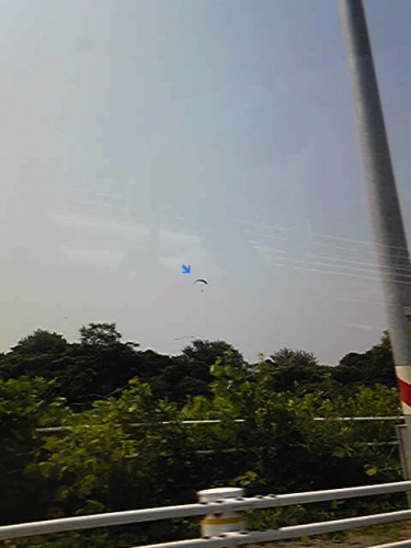 昼間に知多半島横断道路を走っていると中部国際空港(セントレア)を離着陸する飛行機は珍しくないのですが運(?)がいいとパラグライダーの人に出会えます。 やっほーいそういうお日和ってことでもあります。 この時は二機(って数えるの?)、向こうのお山から飛び立って悠々と頭の上を飛んでいきました。気分いいだろうなあ~実際、服の色がわかるくらい近くに見えます。運転中だとあまりキョロキョロできないんだけど、これまた運のいい(?)ことに今日は助手席だったので。