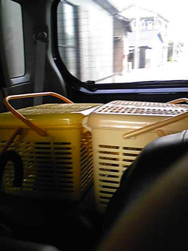 朝からドナドナ猫たちの年に一度のドライブは 「ちっともうれしくない・・・」 私のツイン(車)では暑いので家人の黒ライフで送ってもらった。そしたらお迎え時には・・・ピンクライフにへんし~ん!私らを動物病院に送ったその足で 車検に出してきたらしい(ので、これは代車) なにはともあれ猫たちの年イチの大イベント、つつがなく完了。(お土産付き) や~れやれ!