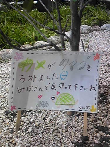 ほう、カメがタマゴを・・・ こんなところで・・・?喫茶店の植え込みに立て札がありました。(向かって左の塀の向こう側です)カメさん、近くの川から上陸してここまできたのでしょうか。 この写真を撮ったのが14日。あれからどうなったか気になる今日この頃。