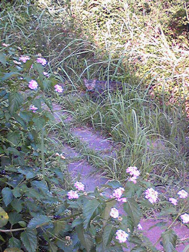 暑い中、我が庭へ ようこそ~。「ん?」と振り向いた小柄なトラちゃん「ここ野原じゃなかったの?」 雨の後、ちょっと草刈りをさぼったらこの有様、なだけです。この時季の草木の伸びる勢いはハンパない。ちょうどエノコログサの穂も出てきたし、ゆっくり遊んでいきなよ。 ・・・と言い終わる前にいなくなってましたが。