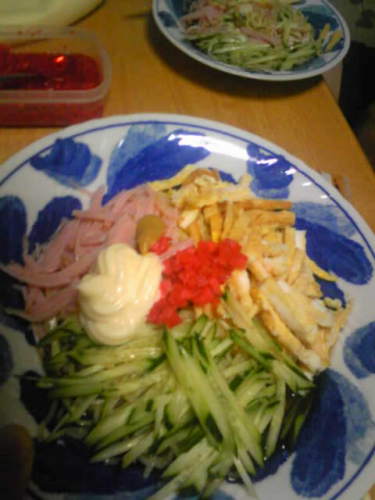 今シーズン我が家にて 初・冷や中(略すか)です。家人の昼食との兼ね合いで、延び延びになっていたのですがやっと今日! 我ながら、もっさりした盛り付けでお恥ずかしい。具材はありきたりだけど量で勝負。(いつものことだ・笑) 折りしも今朝のはなまるマーケットで市販の冷やし中華のアレンジレシピを見たので早速参考にして、タレにおろししょうがとジンジャーエールを加えてうれしいつゆだく(!?)で。 そうしたところが、写真を撮るときにウッカリ皿を傾けすぎて・・・(いつものタレの量なら許容範囲) 机と座布団にけっこうな量を飲ませてしまいましたぁ~///orz/// でも、お味はまろやか・サッパリで美味しかったのでまた作ろうと思いマス。(家人はタップリ残ったつゆを飲み干してました・・・)