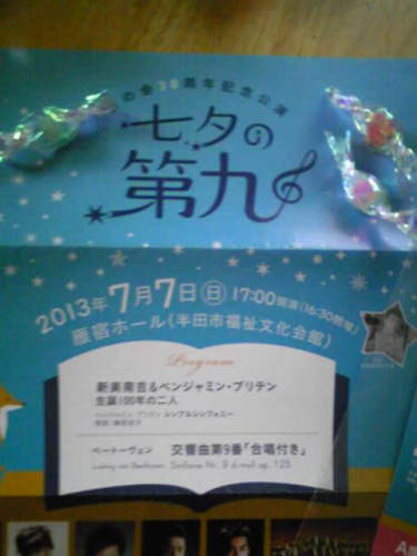 なにか恒例になりつつある七夕コンサート。身内が出演するので半ば強制参加ですが・・・今年は主催の会の30周年の節目で第九「合唱付き」もオーケストラ付き(?)で!(昨年はピアノ演奏でした) 日中あまりに暑くて、夕方出かけるのがおっくうだったけど童話の朗読も素敵だったし、あまり聴く機会のなかったブリテンも良かった。とにかくクオリティが高くてすばらしい公演でした。(ホールも涼しかったし♪)