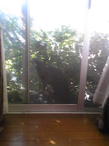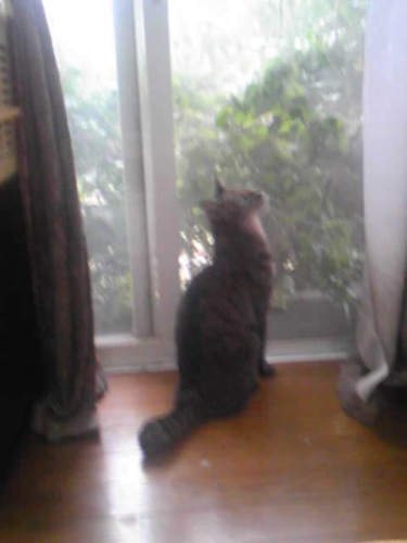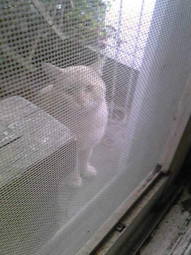 居間で新聞を読んでいて、ふと目線を上げたらそこにグレ王子が・・・黙ってこちらを見ておりました。画像でもわかりにくいけど、肉眼でも全然気づかなかった(笑)動物園だったら、どっちかっていうと こっちが檻の中だ。イヤハヤ。ヒト(私)にはたいそう寛容な王子も・・・ 細猫が気づいてあいさつに寄ってきたらめっちゃケンカ腰だよう~(汗)そこはそれ、売られたケンカは買う細猫ですから・・・ウアーオアーオーーーゥ・・・ブギャギャギャギャーァ!!!ダダダダーン!!!(サッシを挟んで猫パンチの応酬)ガラスも両猫も無事だったけど、網戸の端にちびっと穴が空いちゃった(泣) その頃の太猫。全くもって 我関せず状態。 平和にもほどがある(笑)