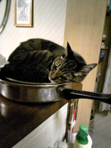 入ってる。フライパンに。 土鍋には入らなかったのに。この季節にステンレスは冷たかろうと思うのに。そのフライパン、今から使おうと思っていたのに。