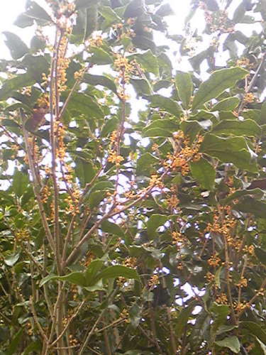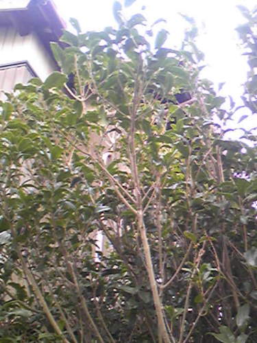10月にはいってから、時折風に乗ってどこかから香りが来ていたので毎日チェックしていたのですが、とうとう 我が家も咲き出しましたよーと、言ってもこの画像では「キンモクセイ」って書かないと なんのことやら状態ですわね。一つ二つ、上の方の枝にやっと確認できたくらいです。これから、に期待です。