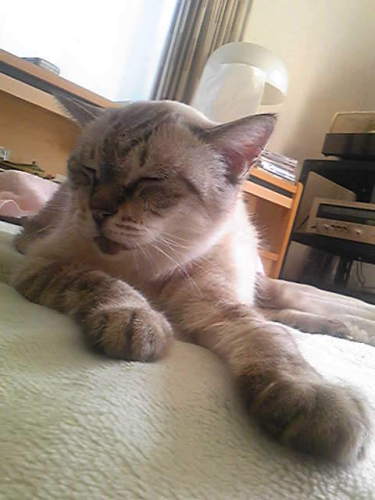 グン!と冷え込んだ朝でしたが日当たりは満点で室内も車内も、およそ「内」のつく場所はぽっかぽかです。 よかったな~、おい。 まぶしくて目があけられにゃいのか(笑)(太猫の眼は光量調節が苦手) で・・・ そのまま寝る、と。 本日、町内の一斉清掃および草刈りでしたが朝一番で階段落ちをやらかしてしまい、肩から腰から足に至るまで、右半身をしこたま打ち、イテテ状態。敢え無く欠席となりました。 で・・・太猫と一緒に寝る、と。