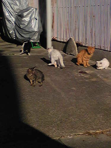 以前、庭の物置きの上で昼寝していたコでしょうかこんにちは♪ 「こんにちは~」 割り込んでくる太猫 「こんにちは~」さらに割り込んでくる細猫 ギャラリー多くて、ごめん(笑)またおいで~(懲りてなければ)