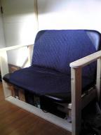 二人掛けソファー完成。壊れた簡易ベットに、2x材で足とひじ掛けを作って、こんなのが出来上がりました。