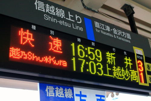 続きですが、途中つまらないので端折っています。柏崎からは、このジョイフルトレインに乗る。なんかスカイツリーみたいなものがホームに(笑)越乃shu*kraという列車です。この列車は上越妙高に行く列車です。そう、だからこれに乗って、次に新幹線で終わるという行程なのよ♪乗車したワタクシ。早速指定していた座席に荷物を置き…。お隣のバーカウンターへ行かねば!!!!!おぉ、もう始まる始まるゾ♪ジャズの演奏です~。お酒だけでなく、演奏会もある「大人の列車」。2回行われ、1回目は柏崎に来る前から既に終えてしまいますが、1回聴ければ十分!本物のジャズを初めて生で楽しむことができました。大人になったら、お酒を飲みながらもうちょっと聴いていたいと思うように…^^海を眺めながらのジャズは、旅の終わりにはいい?悪い?私は楽しみを最後に取っておく性格なので、満足ですー♪聴き入っているうちに、名物「青海川駅」へ到着です。ザザーン…ザザーン…なんと、ここでもミニライブ。青海川駅を出発し、カウンターでそろそろ何か買わないとなぁ~と思った私は何を買うか決めてからバーカウンターへ!!お酒よりスイーツな私は、雪室ドーナツと雪室珈琲のセットでどうだ!しっとり、でも中身しっかりのドーナツに満足!これは2個食べたいなぁ~。さっきあんなに盛り上がっていたバーカウンターも人がいなくなり、何だか寂しいねぇ。終点、上越妙高に到着。日本酒というかアルコール自体に弱いのでお酒は飲んでいませんが、十日町から乗ったら頑張って試飲しようかな~とも思いますね。誰もいなくなったホームにまた寂しさを感じる21歳の私なのであった。このまま回送としてお家に帰るまでホームで待ってました。今日一日お世話になったえちごトキめきから出ます。ありがとう~~これ見たけど、載っている中で半分乗ったのか。結構乗ったなぁ。あとの列車はいいや(笑)またフルーティアふくしま乗りたいなぁ。冬季運行はまた東北本線だし!新潟からいよいよ帰ります。