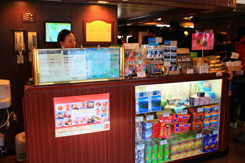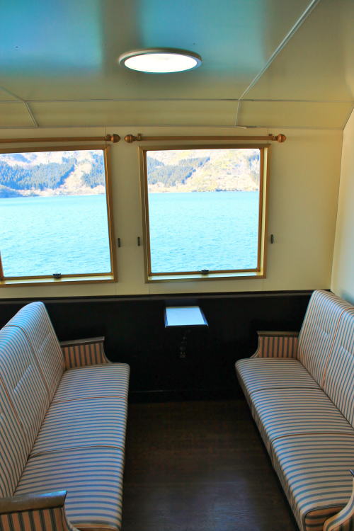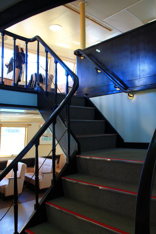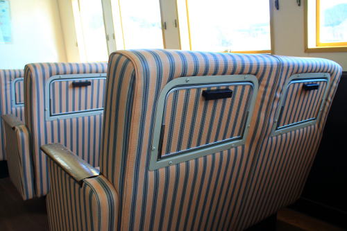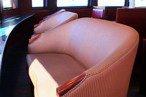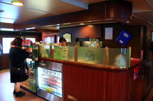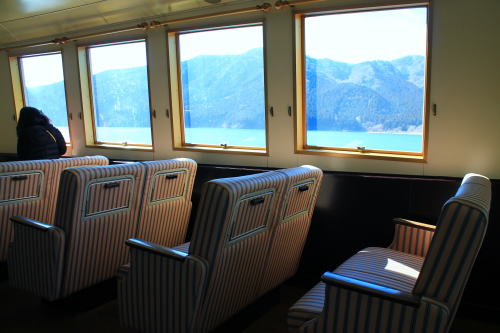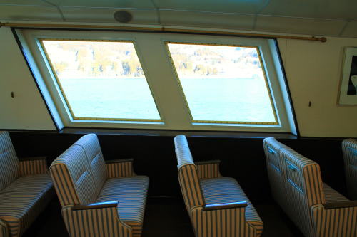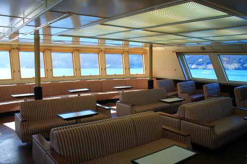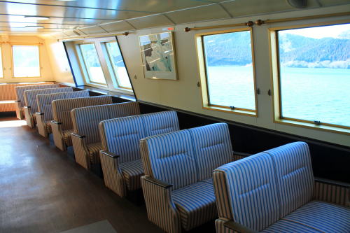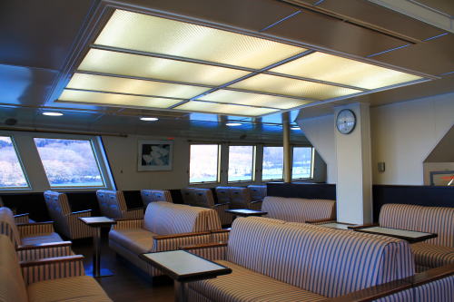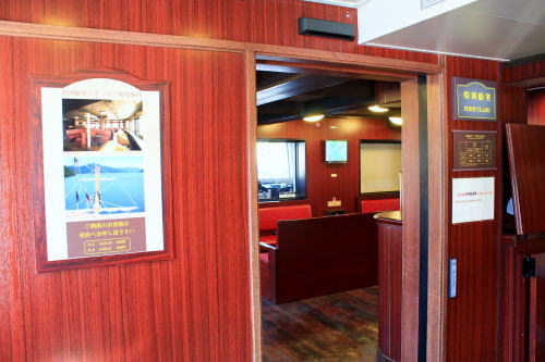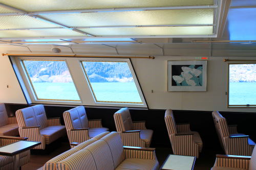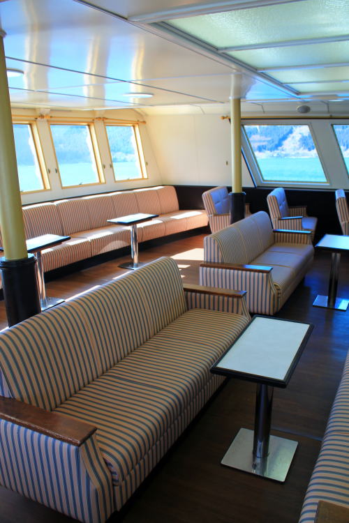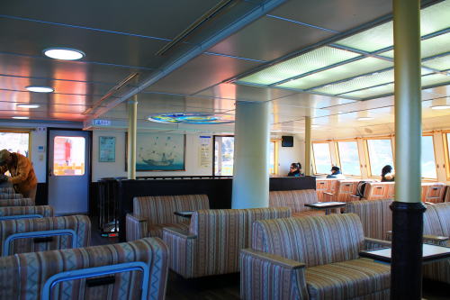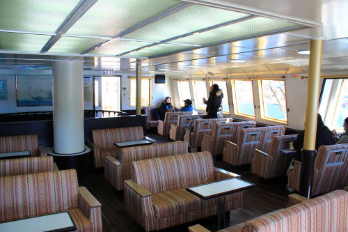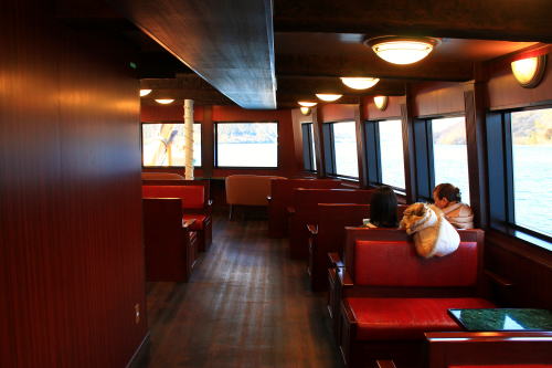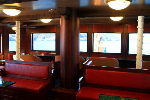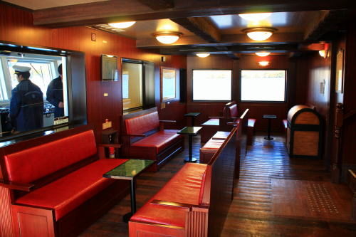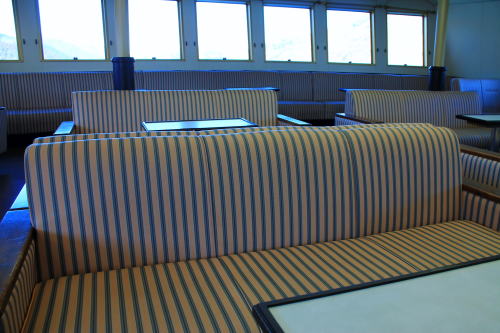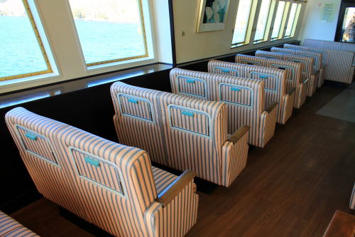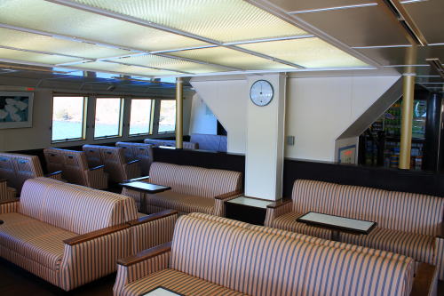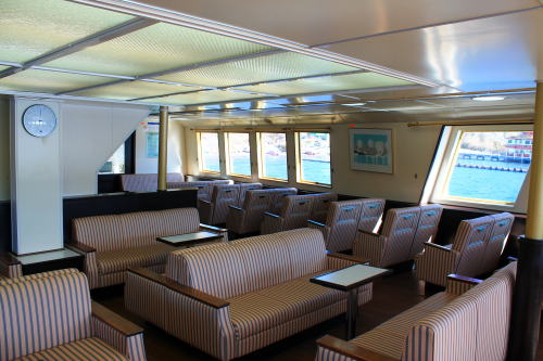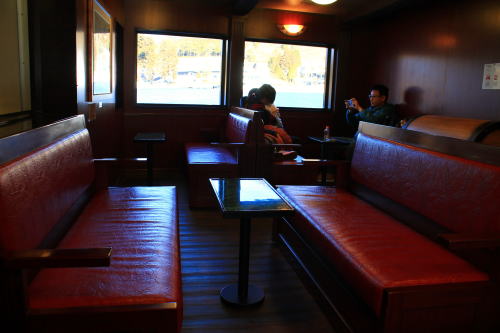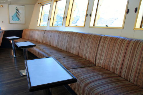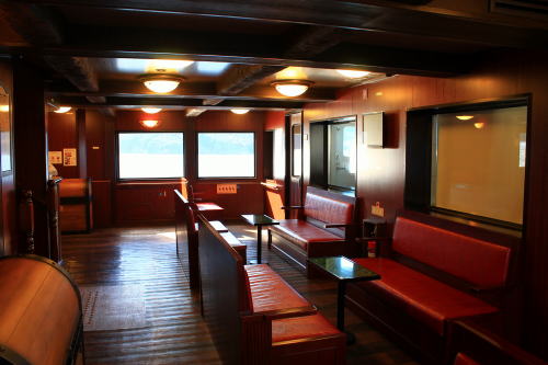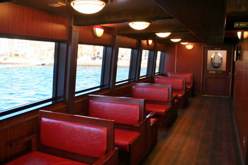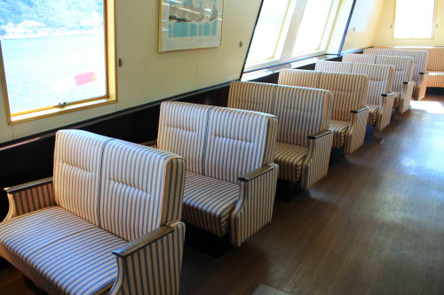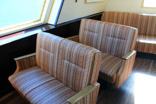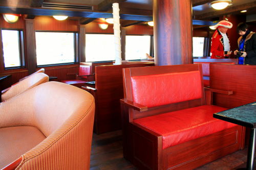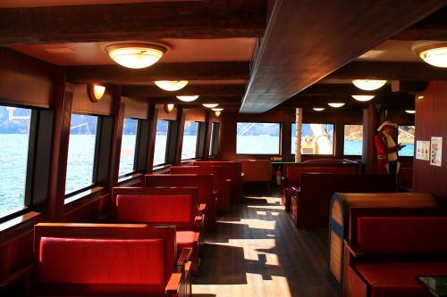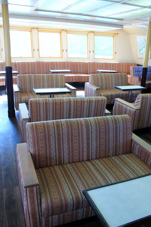 ソファが並ぶ船内。ゆったりとした座席ですが、海賊船と呼ばれる派手さはこの船にはないですね。ちょっと外見だけかな…。それもそのはず、1991年にデビューした船です。