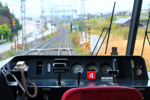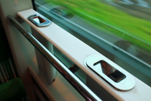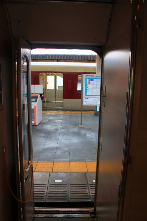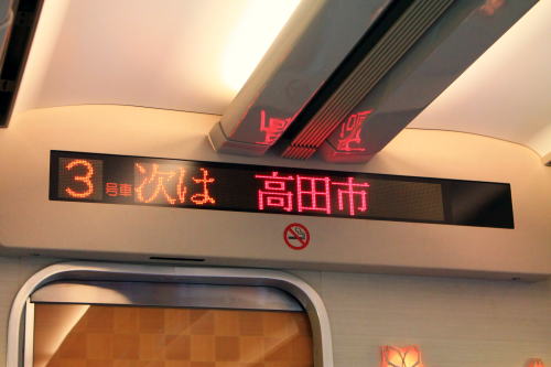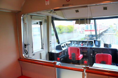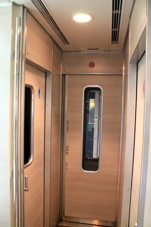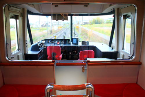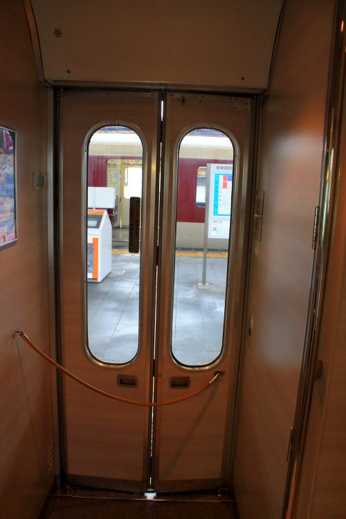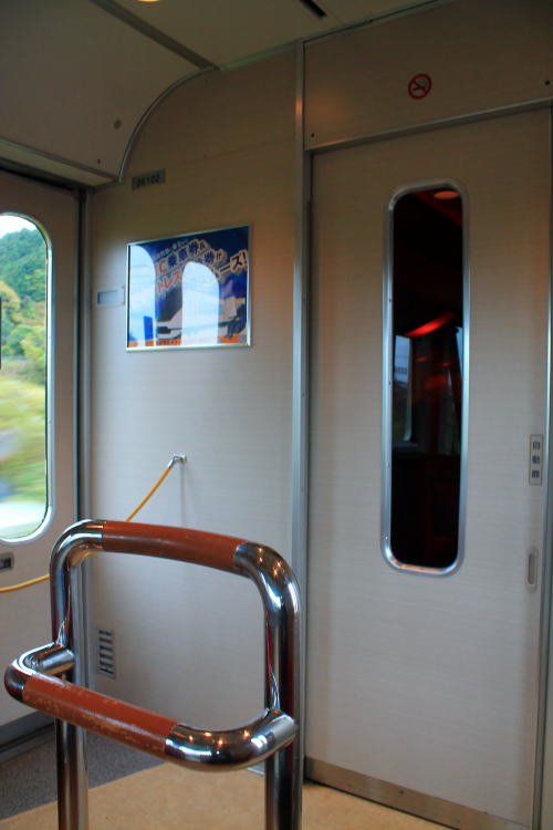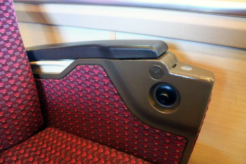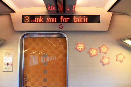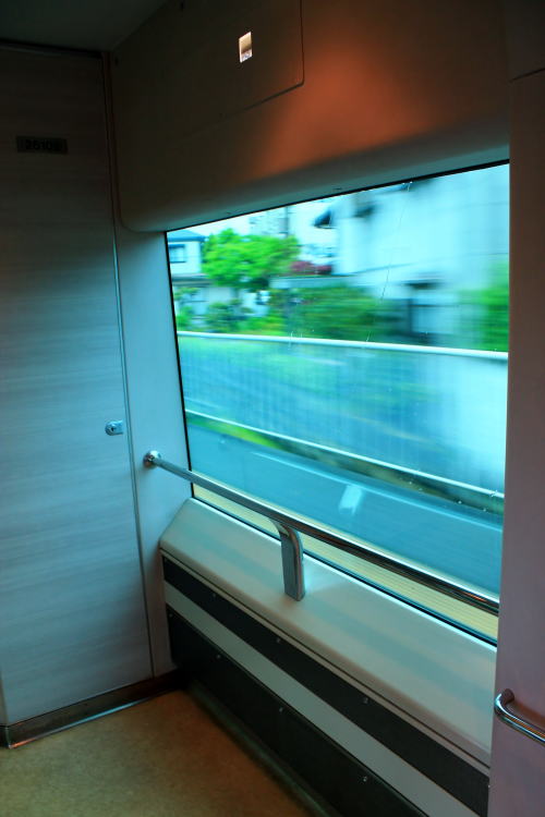 背面と肘掛けのテーブル・フットレスト・コンセントも装備。1時間程度の乗車時間ながらも、レギュラーシートと設備が差別化されていて、名前の通りデラックスな車両です。トンネルに入った際の雰囲気も上々。扉わきにある桜の飾りがかわいいですね。こういうところに高評価!!!