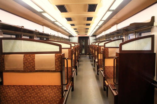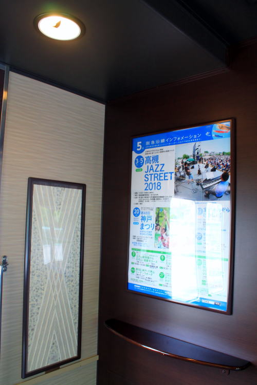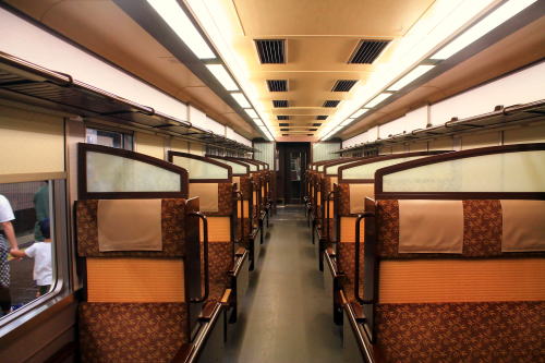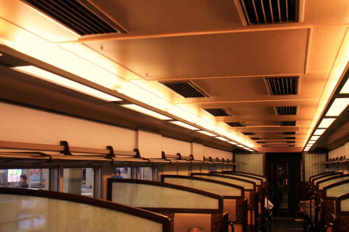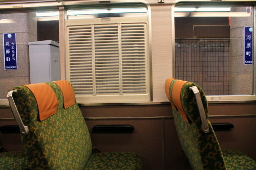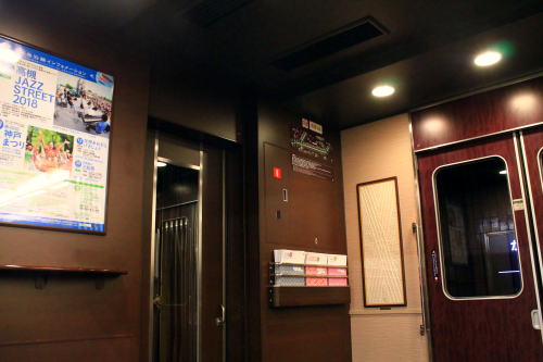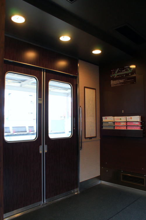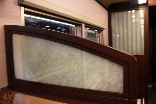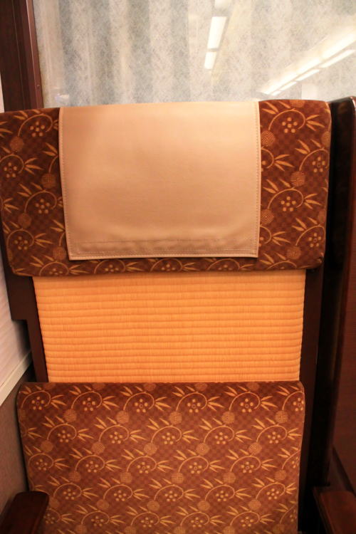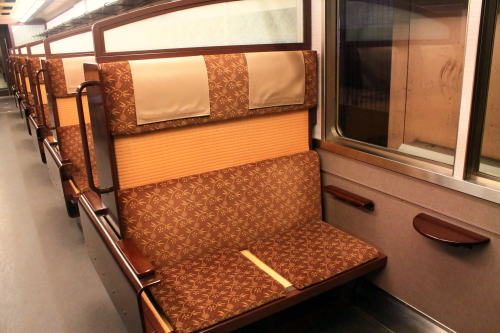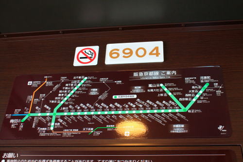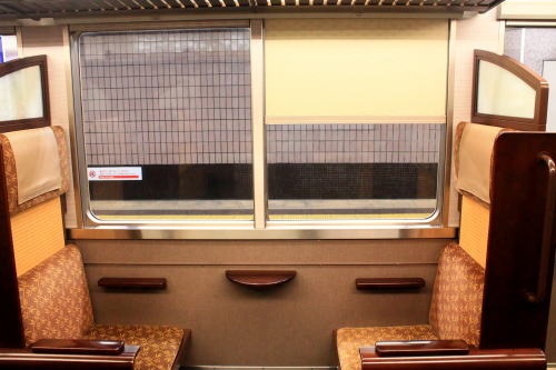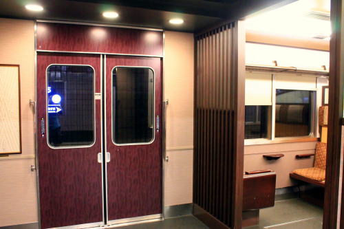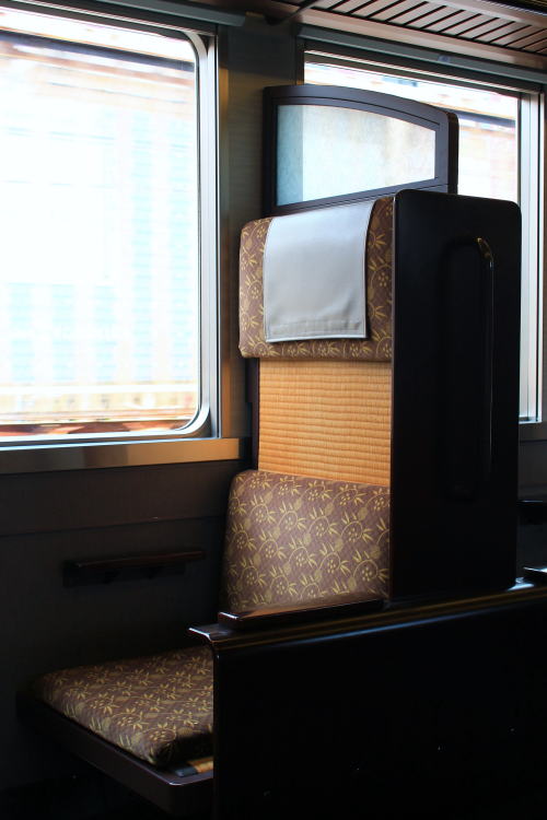 畳の背もたれや伝統的な和柄をイメージされた座席が京都気分を盛り上げてくれますね。阪急でボックスシート…。特徴的な内装なだけに、乗るならやっぱりココでしょうか!