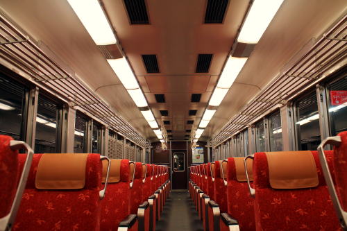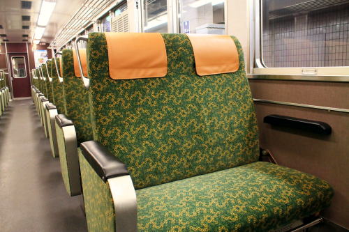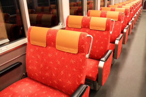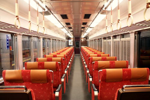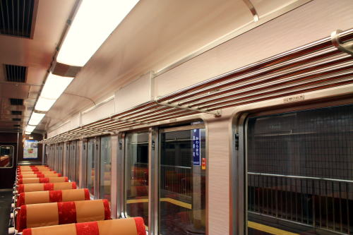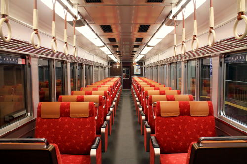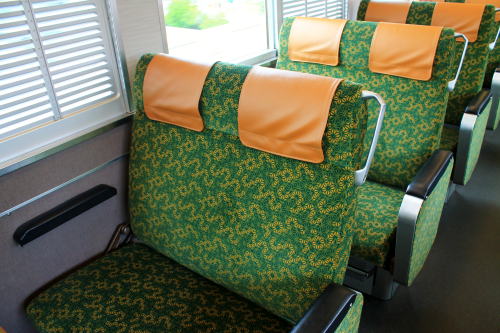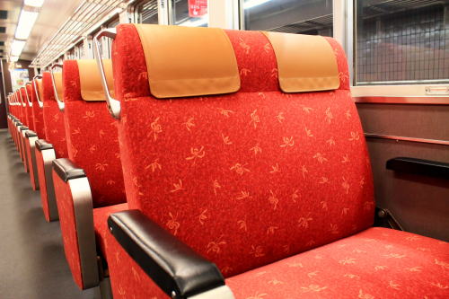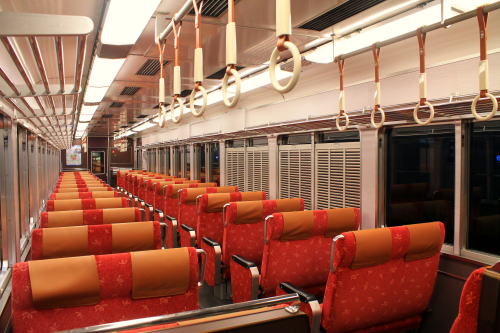 一方で1・2号車は「蘭の花散らし」がイメージされた赤色の座席。阪急京都線のクロスシートがカラフルになりますね。