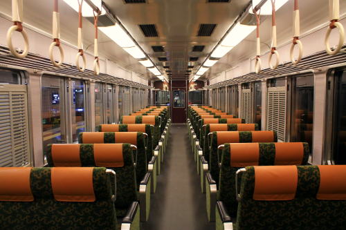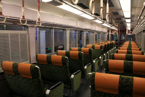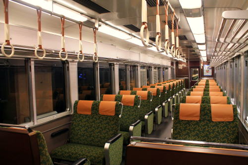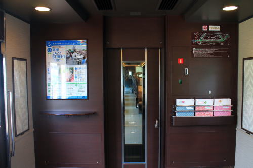 5・6号車は麻の葉イメージの緑色の座席と竹模様のドアが和の趣を演出させる車内。