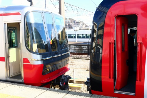 8両運行でしたが、ここからは分割して4両の運転。切り離されるミュースカイはフルカラーLED表示でした。