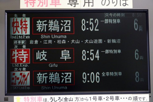 ここからまずは岐阜方面へ行ってみよう。特別席乗車ホームの電光掲示板は昔ながらの表示。
