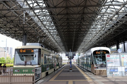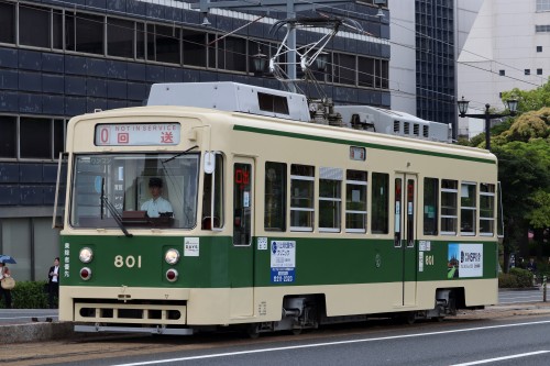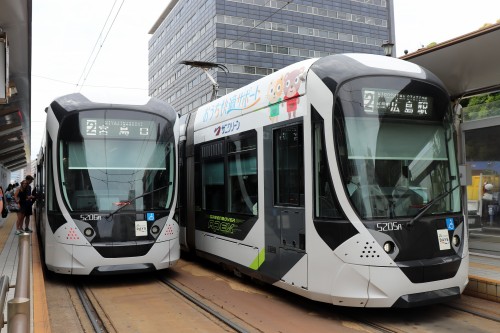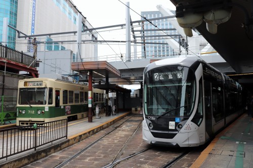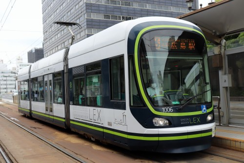 電停で見かけたグリーンムーバーレックス。こちらも非常にかっこよく、岡山のMOMOに負けないデザインです。