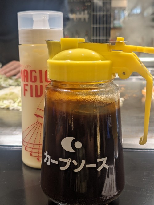 お察しの通り、お好み焼き屋です。お好み焼きの画像は撮っていなくて「カープソース」と「みかんジュース」は撮るという(笑)