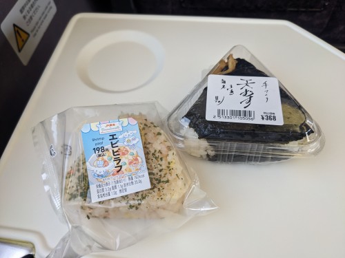 さて、朝食です。豊橋駅で買った天むすとエビピラフおにぎり。