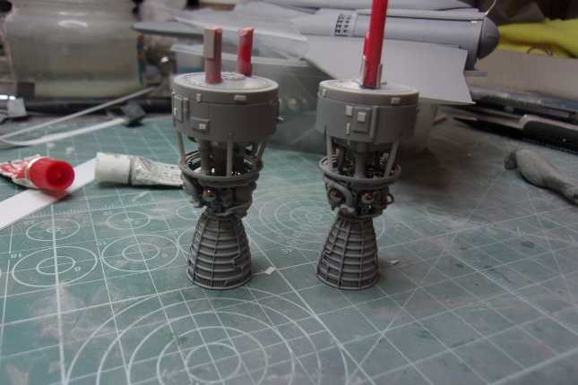 はい、今週の土曜もメタリオン作りです。ようやくエンジンの側ができました。ぱっと見るとかなりいびつですが、それだけ機体本体が複雑な形状をしている証拠です。少しねじるようにして取り付けます。後ろから。ビックバイパーは中央にメインエンジンが付きますが、このメタリオンは今回取り付けた左右の部分にメインエンジンが付きます。中央部分は・・・まだ未定です。裏側に付くパーツはかなり無理矢理なのでこの様な大きな隙間ができてしまいます。ここはディスプレイ上、力が加わる予定なのでちょっと厚めのプラ板で修正しました。エンジンの大まかな形はほぼこれで決まりです。黒い部分はキャタピラーを巻いてあります。隙間埋めも最終段階。薄いプラペーパーを使っていますがこれが時間がかかるのなんの・・・。ノズル部分はこうなる予定です。エンジン本体とのつながりが不自然なのでパイピングを追加したいですね。サフを吹いて今日の作業の確認。70~80年代のアニメに出て来そうなデザインですね(;^_^A塗装の事もあれこれ考えていますが・・・今回はデカールを自作してみようかとも考えています。まだまだ未定ですが。明日はライザ作りの予定ですが今日の作業があまりにも中途半端だったため、ライザと並行して作業するかもしれません。ああ・・・時間が欲しい!