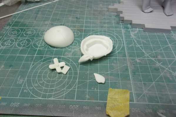 日曜恒例のライザ作りです。形づくりはほぼ終わったので表面仕上げをしています。強いライトを当て、それでできる影でキズと凹凸を確認します。一週間放置するとその前の週には気づかなかったキズって結構見つかるんですよね。かなりしっかり磨いたはずの右太腿ですがご覧のように大きな凸が・・・。ラッカーパテの硬化によるヒケが原因です。ここ数週間ずっと表面仕上げばかりでしたので気分転換を兼ねてその他の細かいパーツにも取り掛かりました。ここからパーツを切り出します。ペンダントです。2のライザはここが鍵なのが特徴です。首にかける紐部分は作り直すためカットしてしまいます。危なかったのがこのイヤリングです。最初は星の部分だけカットしようとしましたが、実は丸で囲んだ部分までが一つのパーツでした。髪部分は相変わらずバリと段差がひどいです。ガレキあるあるですねw特に毛先の細い前髪はフィギュアの命と言うべき顔の見栄えに大きくかかわるため、時間をかけて丁寧に処理します。処理が終わりました。あまり細く削ると塗装中に折れてしまうためこの程度にとどめておきます。頭部を接着しました。首の前側だけ1mmプラ板をかませて角度を変えてあります。後ろはぴったりくっつくはずでしたが、このように隙間ができてしまいました。原因は肩回りを肉付けした結果、サイドの毛先が肩にぶつかって頭部全体が浮いてしまったためです。まあ首そのものの太さも見直したかったのでパテ埋めすれば問題ありません。本日の最終仮組みです。何となく短足に見えますが撮影角度と距離のせいですwこのフィギュアは見る角度が逆になるとかなり見栄えが悪くなる印象があります。こればかりはどうしようもありません。ちなみにこの後やはりどうしても頭部の角度に納得いかなかったのでボキッ!と折ってしまいました。もう一度接着位置を見直して、次はきちんと真鍮線で軸打ちして固定させます。塗装まではもう少しかかりそうですね。